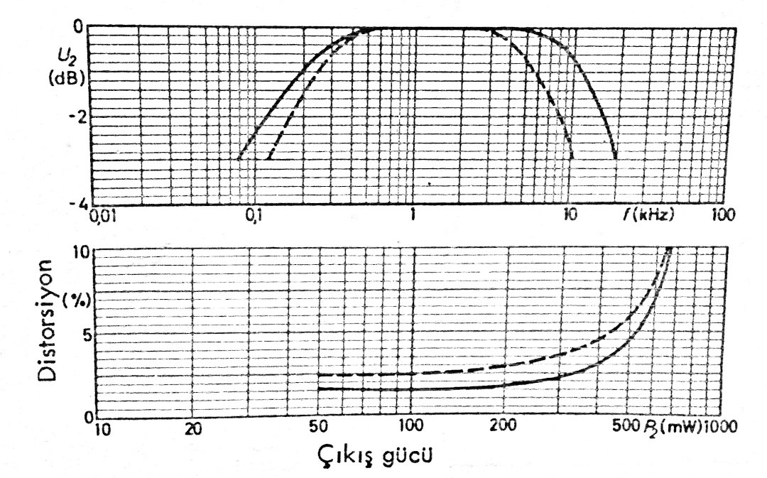 Şemada belirtilen değerlerde 9 Volt beslemede 0,65Watt veren bu devrenin frekans bandı eğrisi ve distorsiyon eğrisi aşağıdaki grafiklerde yer almaktadır.